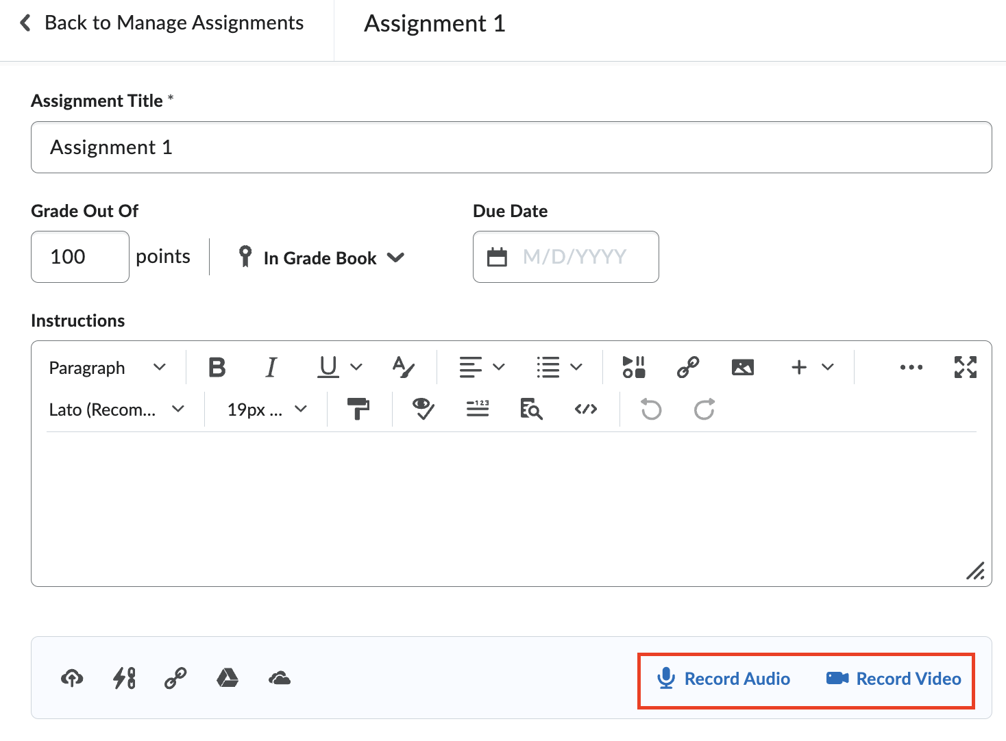 Audio and video recording is available in the content editor. Under the content editor, click Record Audio or Record Video to start.