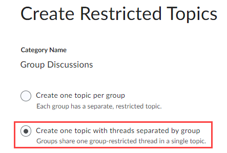 - Create one topic with threads separated by group: choose this one if you want all groups have the same discussion topic. If you enable grading the group discussion, only one grade column is created in the Grades page.