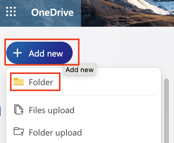 2. On your OneDrive page, click "Add new" and then select Folder to add a new folder. Fill in a meaning full name, e.g. ENG 125 KM Spring 2024 Group Projects.