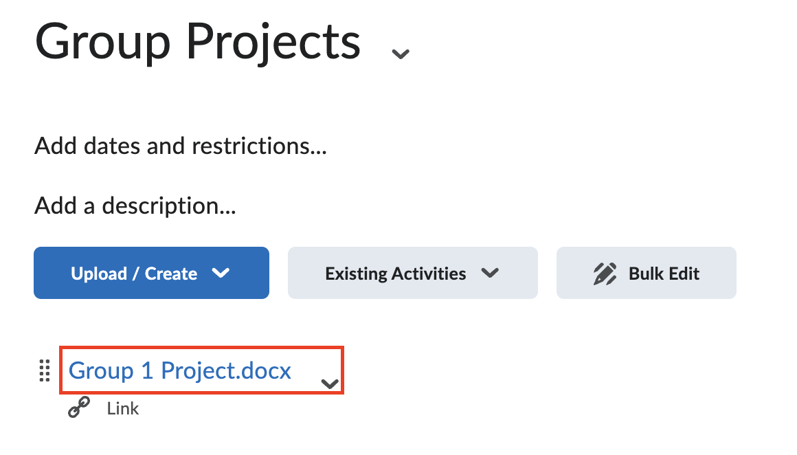 Now you are back to your course content page for the Group Projects and the link to the OneDrive file for group 1 is posted there. Members in Group 1 can click the link to access and work on the file.