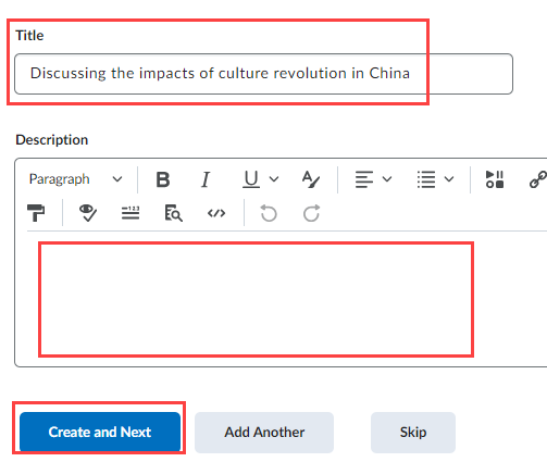 8. Continue to set up the discusison topic. Fill in a Title and, optionally a Description if you already provide instructions about the group discussions somewhere in your course. If you don't have a document to provide group discussion instructions, you should fill in the instructions in the Description text box here. Afterwards, click Create and Next.
